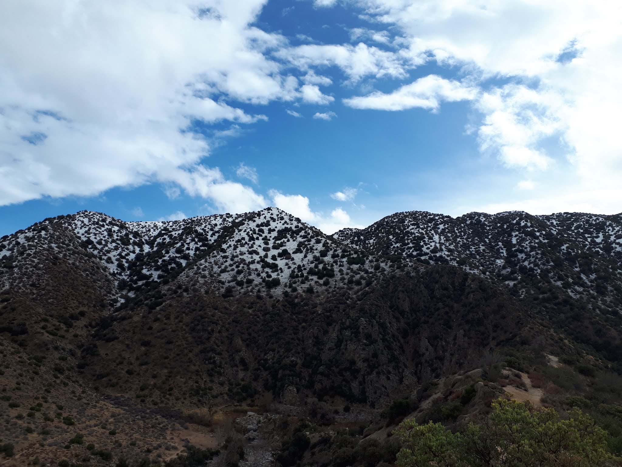 A partir de ahí, un amigo y yo compramos burritos y conducimos hasta una montaña en Apple Valley para dormir. En la mañana, fuimos abajo a los aguas termales. Fue tarde cuando finalmente los nubes empiezan a viajar más cercos, cruzando afrente de la luna y trayendo un aíre frío. Las lluvias llegaron pronto y transformaron a granizo en la medianoche, haciendo mucho ruido en la tienda. Al despertar, las montañas eran cubiertos en nieve, sombreritos para todas de sus cabezas, asomando por encima, quieta y pacífico en la luz suave. Nosotros crujimos hasta el camión a través del hielo, crujiendo agradablemente bajo pie.