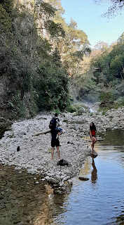 Bertha y yo caminemos al centro, abajo del sol y con toda la humedad del mediodía. Descansamos en el Parque Colosial y cenamos con su hermano afuera en un restaurante saludable y rico. En sábado, fuimos los tres a Puente de Díos en Tamasopes. Aunque tuvimos que rentar chalecos, encontramos una pozita a lo largo del río, bloqueado de la otra gente y su ruido con rocas altas. Desde allí, relajamos con gusto el sol y el aire fresco. Exploramos las cascadas y algunas cuevas extrañas con un luz brillando azul del abajo, como si estuviera un tesoro de piratas escondido o perdido en el agua. Cenamos en Yakas, un restaurante de lujo, donde compartimos pescado zarandeado. Sentado en el balcón, miramos a los aves que volaran a dormir, el cielo detrás transformándose los colores poco a poco hasta se oscuró completamente.