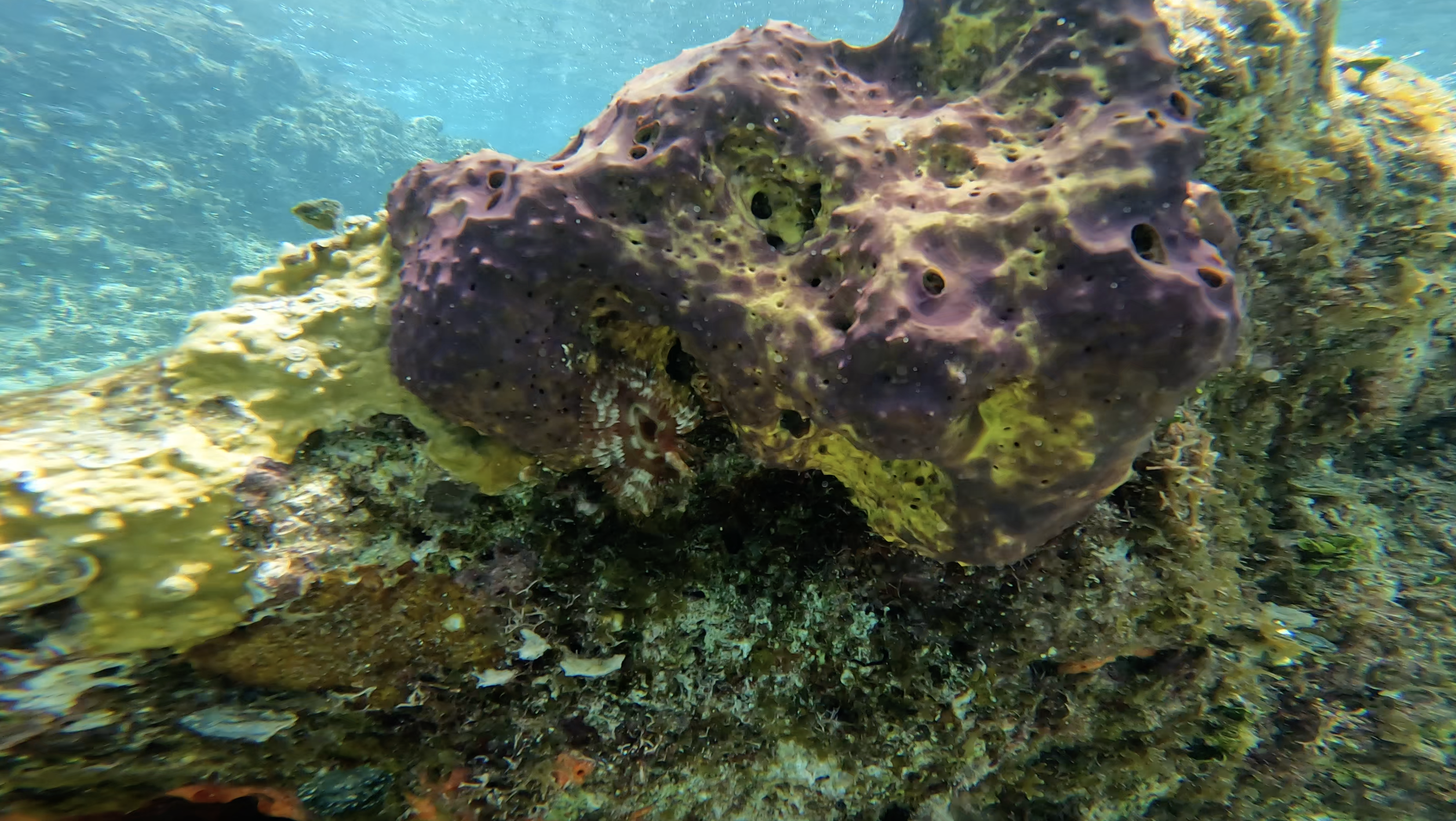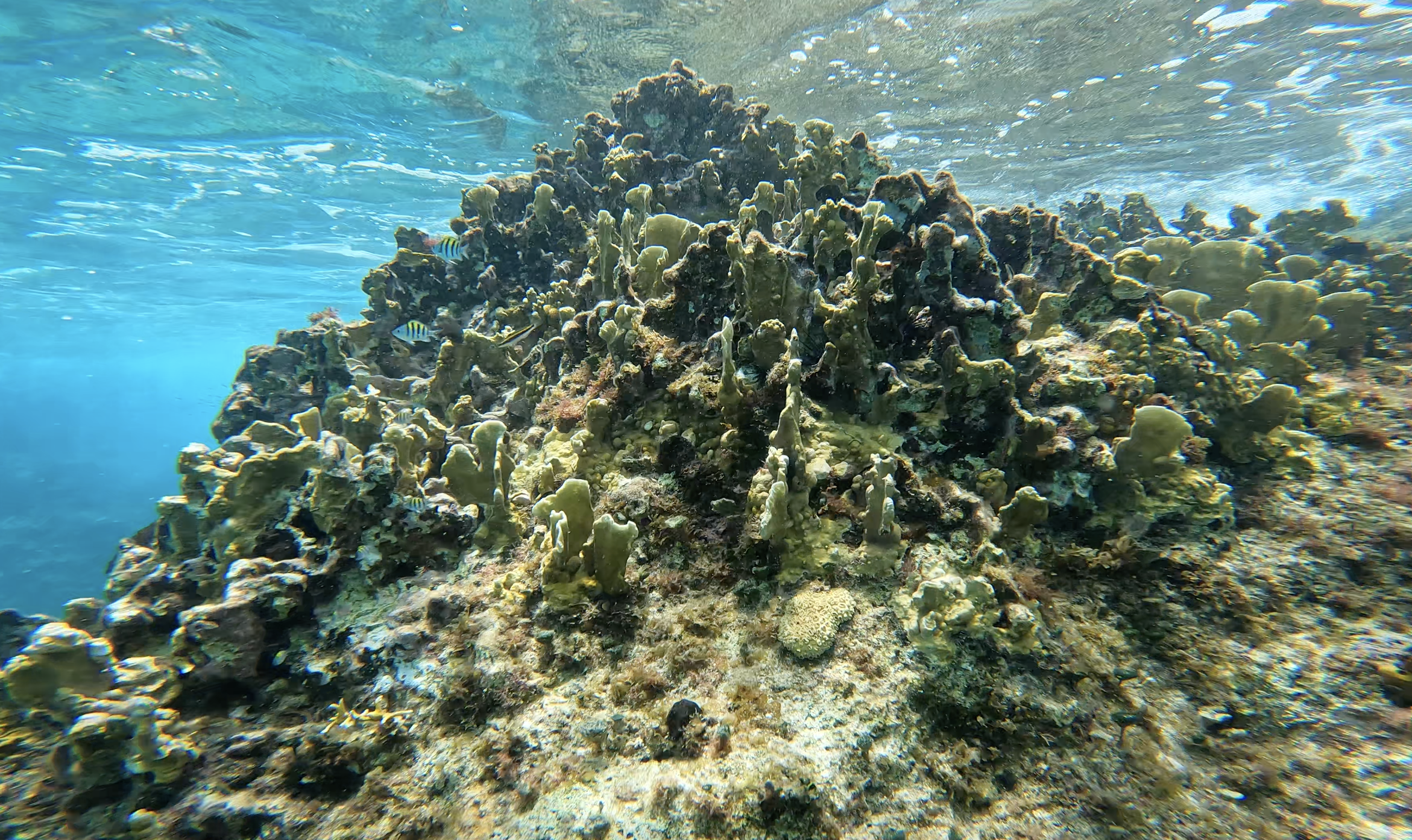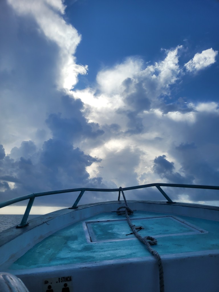 La mañana siguiente, nos encontramos de nuevo en una lanchita, de una vibra mucho más chill. Nos explicó 30 minutos antes de que bajamos al agua un poco sobre la biología de la región, y enseñó lo básico del buceo. Después de un minuto abajo, empecé a frikear, mi sistema intentando comunicarme que ya has estado mucho tiempo bajo, hay que respirar. La instructora Miri me captó con su mirada firme, intensa, y bonita, moviendo su mano como una ola hacia afuera y hacia ella, calmándome con su imitación de la respiración, del viento. Gestionó alrededor para decirme, mira todo esta maravilla, abre la mirada y observa toda la belleza que hay.